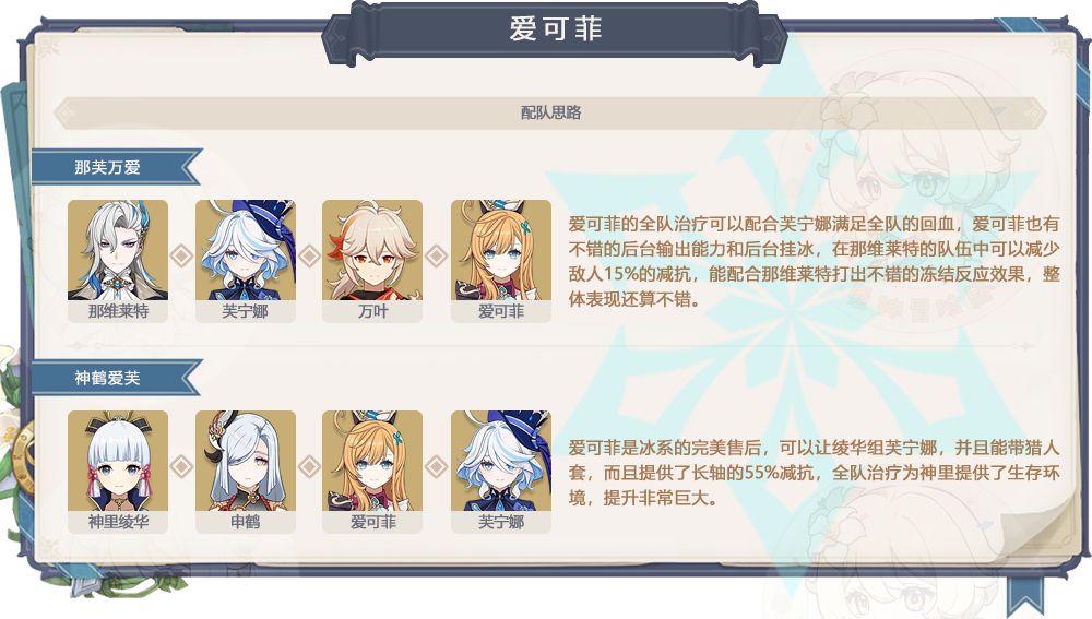 2、爱可菲抽取建议:0命机制就完整,有资源条件非常推荐抽一个,冰系主C必抽的专辅,也是一个非常不错的对策卡,0命冰水C都能用,命座仅提升对冰C的辅助能力,1、2命提升比较大,6命氪佬可以冲