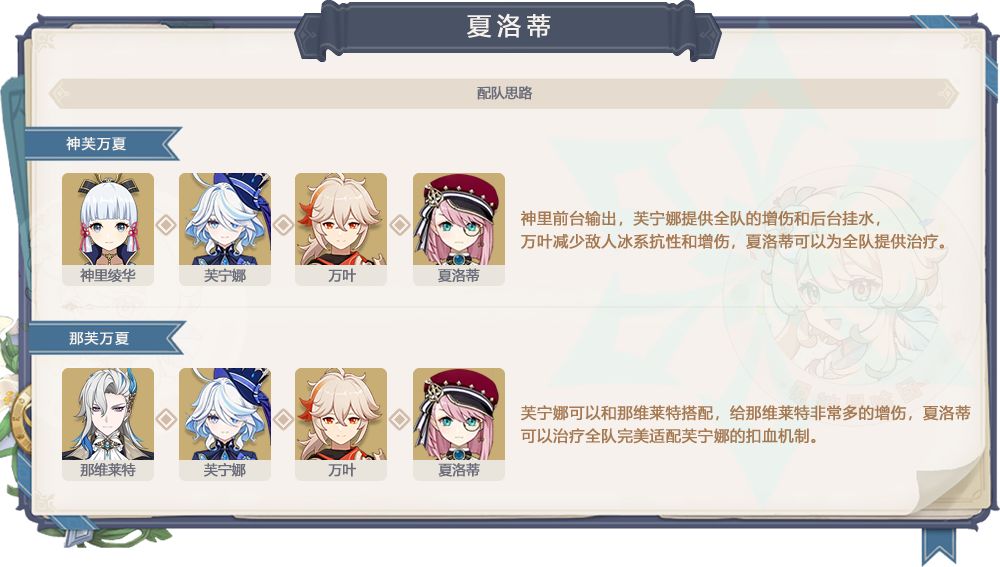 4、夏洛蒂抽取建议:夏洛蒂是一个不错四星全队奶角色,适合配合芙宁娜,现在有很多替代角色,并不需要特意去抽,命座没有非常核心的机制命座,不用刻意去补